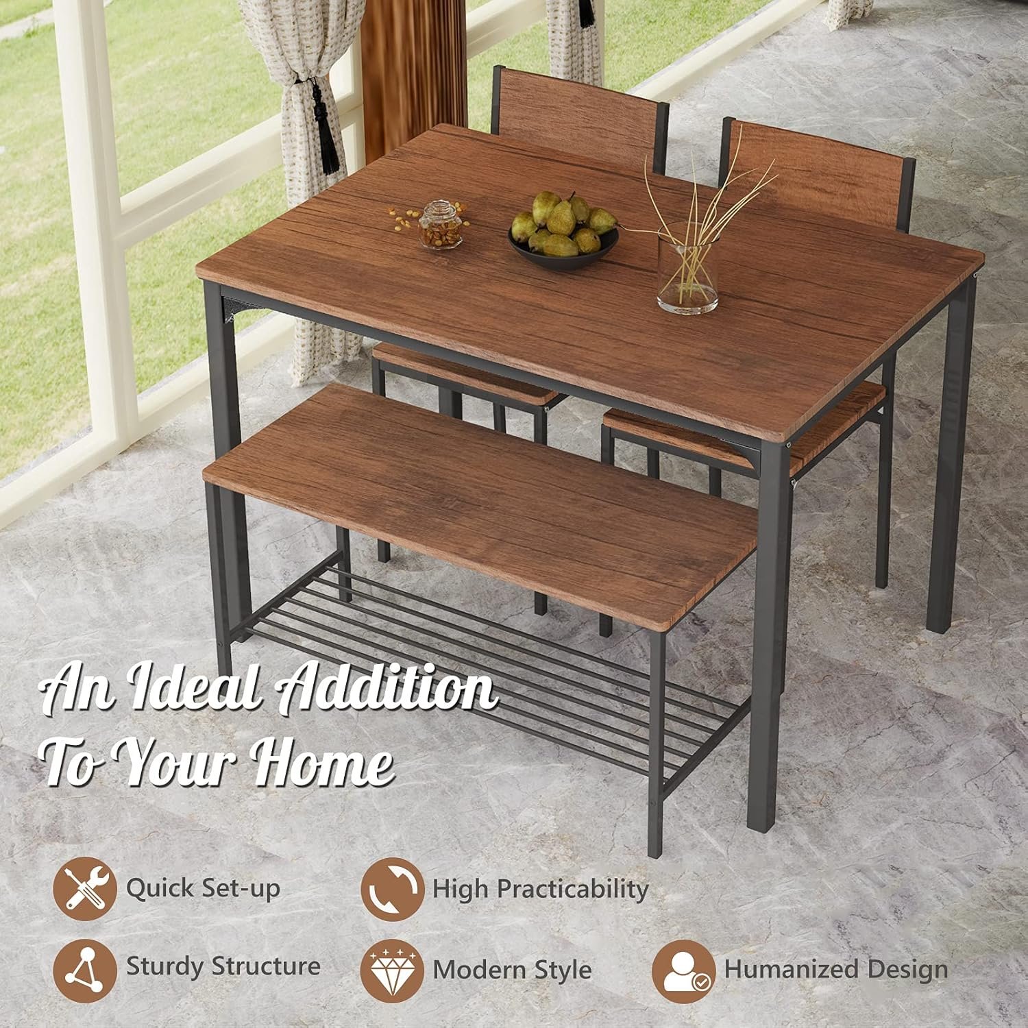 The Giantex 3-Piece Kitchen Dining Set combines industrial style with functional design, featuring a sturdy metal frame and a space-saving table with two benches that tuck neatly underneath. Its waterproof surface and sleek wood grain finish make it perfect for modern kitchens or small apartments.
